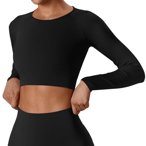 Maglia sportiva da donna, a maniche lunghe, senza cuciture, per yoga, fitness, palestra, a maniche lunghe, traspirante, Top nero, S Report This