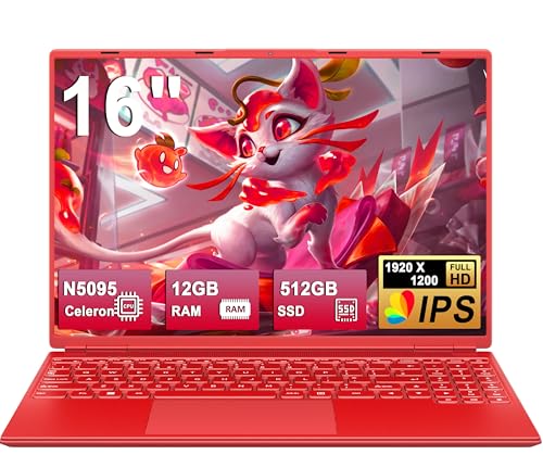 NOTODD Computer Portatile 16 Pollici 4 core Celeron N5095 (fino a 2,9 GHz),12+512GB SSD Supporto Estensione 1TB,PC Portatile Win11 con 5G WiFi 1920x1200 BT4.2 AZERTY Tastiera Copertina-Rosso