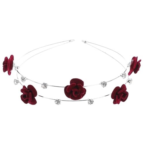 Beaupretty Elegante fascia a doppio con strass scintillanti e decorazioni a rosa, rosso vinaccia, eleganti accessori per capelli per ragazze e donne, ideali per feste e feste