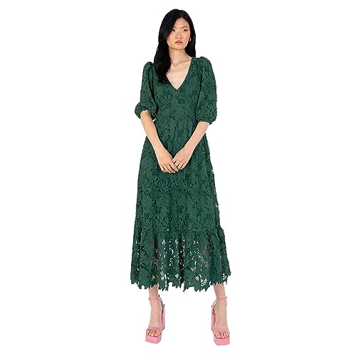 Maya Deluxe Women's Midaxi Dress V Neckline Puff Sleeve Lace A-Line for Wedding Guest Bridesmaid Cocktail Prom Evening Occasion Vestito, Emerald Green, 40 Donna Report This