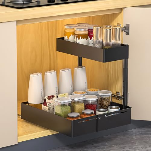 1 organizer estraibile per armadietto per lavello: doppio strato, organizer regolabile in altezza, sotto il lavandino, mensola per cucina, bagno, armadio (nero, 1 pezzo)