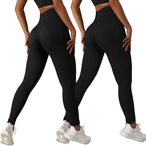 Scrunch Butt Leggings da donna Gym Leggins High Waist Booty Lift, 2 pezzi: nero a coste, X-Small-Small
